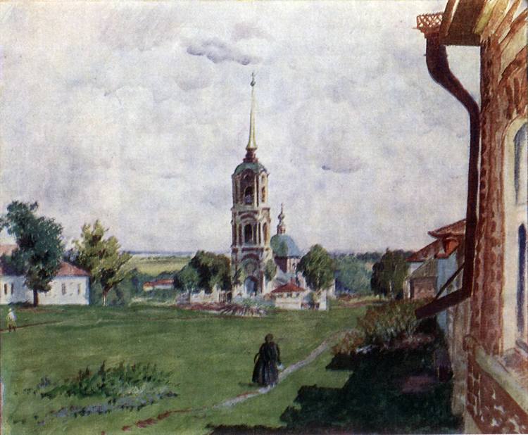 Вид на церковь Варвары Великомученицы (1821) с колокольней и дом купца Грошева с красной крышей, в котором Левитан и его спутница художница Софья Кувшинникова снимали комнаты, запечатлен с Петропавловской горы.