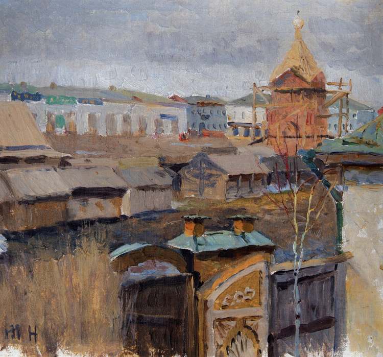 Нестеров, уроженец Уфы, запечатлел момент, который позволяет усомниться в датировке картины 1884 годом. В этом году он, будучи студентом московского училища живописи, ваяния и зодчества, приезжал в родной город, в том числе писал некоторые работы. Но вряд ли в это лето он мог изобразить строящуюся часовню св. Александра Невского на Верхнеторговой площади, которая была хорошо видна из окон отцовской усадьбы (ее фрагменты - ворота и угол главного дома, который выходил фасадом на ул. Центральная, обрамляют композицию снизу и справа). Каменная часовня у торговых рядов по проекту петербургского архитектора Александра Ивановича Семенова (1856-1908), работавшего в Главном инженерном управлении Генерального штабы и ставшего вскоре академиком, была заложена двумя годами позже (проект опубликован в февральском номере журнала "Зодчий" за 1887 г., чертеж 7) - 9 июля 1886 года, во второй день торжеств, посвященных празднованию 300-летия Уфы (Уфимские епархиальные ведомости № 13/1 июля 1886. С.409). Торжественное освящение часовни состоялось 17 октября 1889 года (Уфимские епархиальные ведомости № 21/1 ноября 1889. С.680). Чин закладки и освящения совершил епископ Уфимский и Мензелинский Дионисий. Часовня была освящена во имя святого благоверного