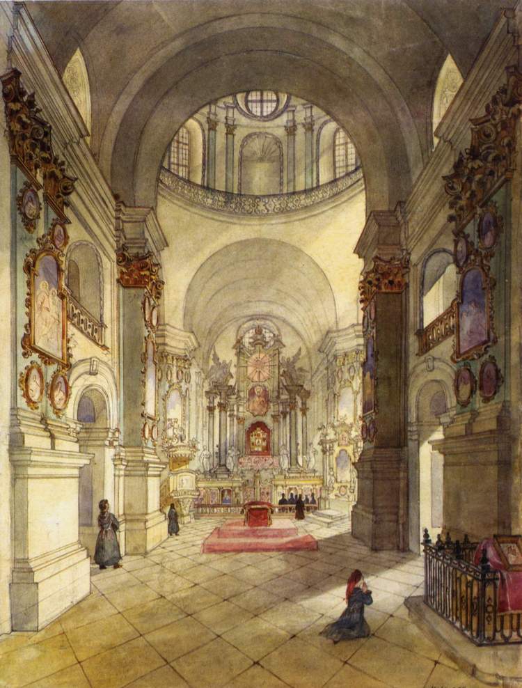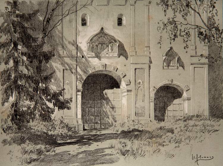 На рисунке на заднем фоне изображен Виленский православный Свято-Духов монастырь (вид со стороны городской стены). Свято-Духовский мужской монастырь учрежден иноками православного Троицкого монастыря при церкви Святого Духа. Троицкий монастырь был основан на месте казни виленских мучеников Антония, Иоанна и Евстафия в дубовой роще на окраине Вильны. Казнь была совершена в 1347 году, а через два года православные выпросили себе для молитвы святую горку и построили на ней деревянную Троицкую церковь. В 1609 году Троицкий монастырь был отнят у православных униатами, и братия вынуждены были перебраться к церкви Святого Духа, построенной близ Троицкого монастыря в 1597 году. Когда город заняли поляки в 1661 году Свято-Духов монастырь стали обвинять в измене, в пособничестве Москве. Обитель оскудевала братией, но при ней продолжала существовать школа. Монастырь пользовался поддержкой со стороны Петра I, который дал монастырю жалованные грамоты и льготы. Во время страшного пожара в 1749 году Свято-Духов монастырь сгорел полностью, за исключением маленькой девичьей церкви. Русское правительство отпустило на возобновление церкви 6000 рублей. Последнее жестокое надругательство над монастырем поляки-католики совершили в 1794 году, ограбив его. Возрождение обители началось с 11 августа 1794 года, когда Вильна стал губернским городом Российской империи. Современный вид сохраняет после реконструкции 1873 года, при которой Свято-Духовская церковь была перестроена по образцу православного храма, так как ранее походила на костел.
