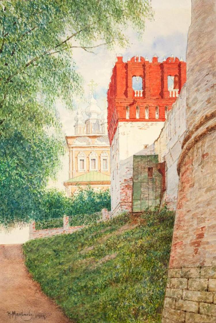Внизу справа подпись тушью: "Снималъ и рисовалъ Архитекторской 1го Класса Помощникъ Матвей Казаковъ". Под рисунком надпись тушью "Видъ с северо-восточной стороны внутри новодевичьяго въ Москве Монастыря".