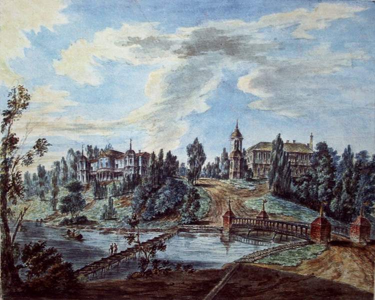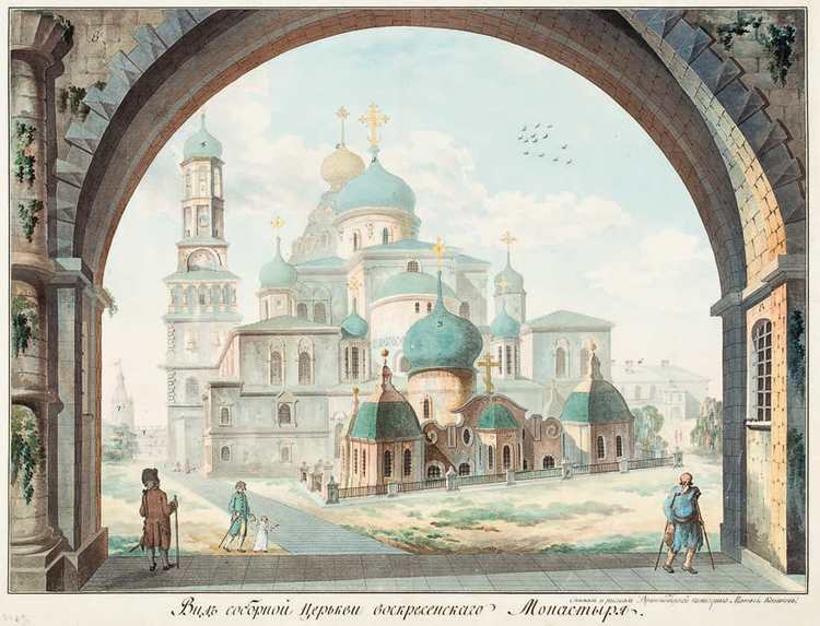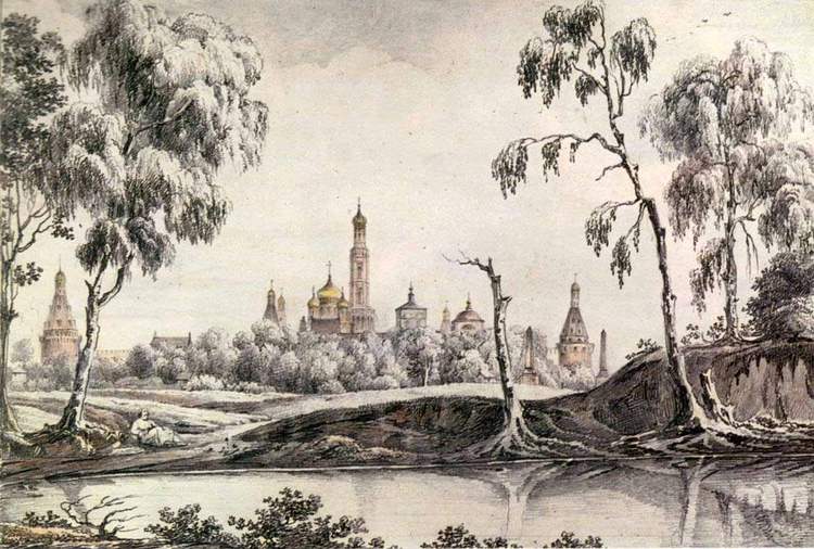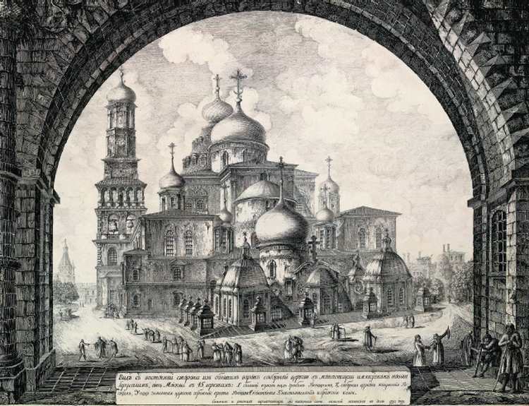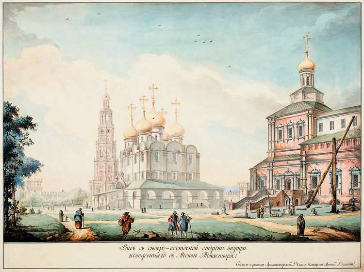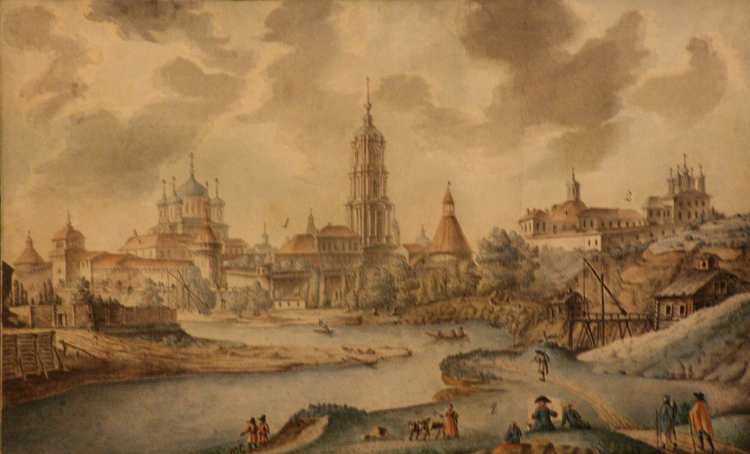 М.Ф. Казаков в 1790-х гг. принимал участие в восстановлении монастыря после пожара. Возможно, тогда же вид монастыря выполнил его сын Матвей, получивший в 1798 году в возрасте 17 лет звание архитекторского помощника.