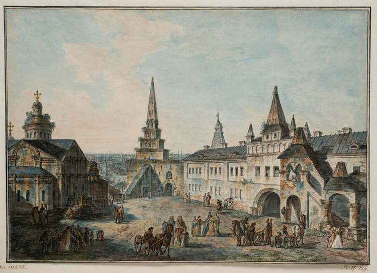 Вид в Кремле на церковь Рождества Иоанна Предтечи, Боровицкие ворота и Конюшенный двор.