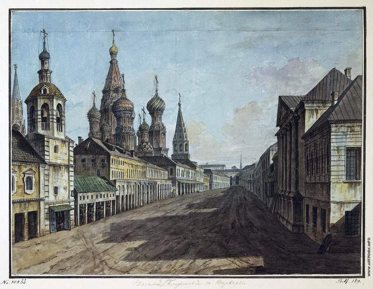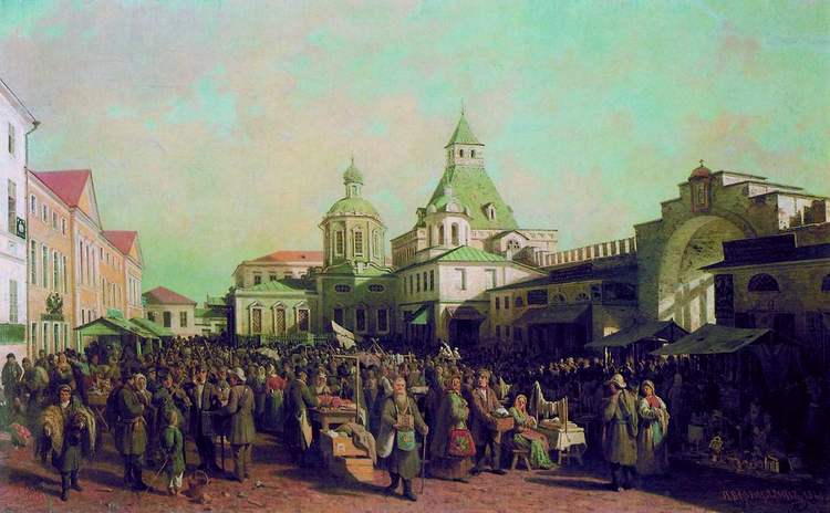 Во второй половине XIX века московский Толкучий рынок располагался у Китайгородской стены. Он существовал до 1890-х годов. На картине изображена часть рынка с наружной стороны стены, на Никольской улице, справа Никольские ворота. Впереди видна московская часовня во имя великомученика Пантелеимона Целителя. Часовня была выстроена русским монастырем Святого Пантелеимона на Афоне для афонских святынь, - части мощей великомученика Пантелеимона, святого креста с частицей Животворящего Древа Креста Господня, части от камня Гроба Господня и иконы Божией Матери "Скоропослушница". Кроме этих святынь в часовню были помещены чудотворный образ Спасителя, чтимый список Иверской иконы Божией Матери и чудотворная икона великомученика Пантелеимона. В 1880 году брат настоятеля афонского Пантелеимоновского монастыря, потомственный почетный гражданин Иван Сушкин подарил монастырю для строительства часовни участок своей земли на Никольской улице ближе в Владимирским воротам. Башня Владимирских ворот возвышается справа от купола часовни. В 1934 году часовня вместе с Китайгородской стеной была разрушена. В настоящее время здесь располагается Лубянская площадь.