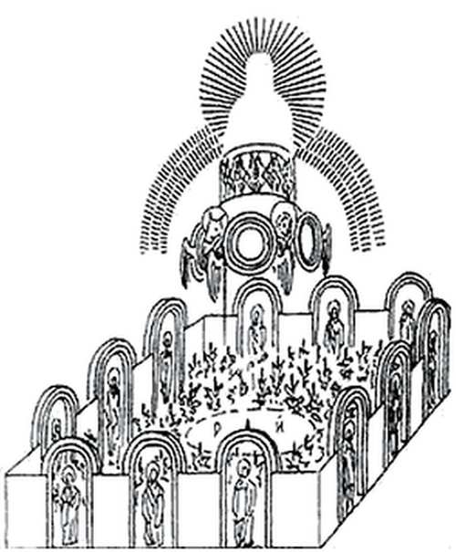 Здесь, однако, целесообразно напомнить образ Сидящего на Престоле, представленный в видениях пророка Иезекииля (Иез. 1: 10, 15, 16, 22; также 10: 9, 10, 14). Престол поддерживают четыре многоочитых херувима, под которыми четыре колеса, а над ними — свод (это своеобразная опора Престола, «подпрестолье»). Над сводом виднелось подобие самого Престола, а над ним — как бы Подобие Человека. На поздних средневековых рисунках в центре Небесного Града изображались Престол в виде куба с Крестом наверху, или Лобное место (Голгофа) с Крестом, или Агнец с Крестом, или Христос.