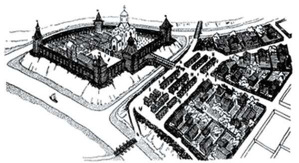 Каменный соборный храм был главной святыней русского города со времен крещения Руси. Стоял он внутри крепости, возвышаясь над ней своими закомарами, верхами с золотыми крестами. Внутренность обычно деревянной крепости наполняли также клети крома (склада) и маленькие осадные дворы жителей города. Сами жители вольготно проживали на посаде и в слободах под крепостью, имея дворы, дома, хозпостройки, огороды, сады, скотину, птицу... Между крепостью и посадом, используя пространство обстрела перед стеной, обычно размещался городской торг с рядами, лавками, амбарами, гостиными дворами, кузницами. Такая структура древнего русского города: храм, крепость, торг, посад была «типовой», характерной для сотен городов.