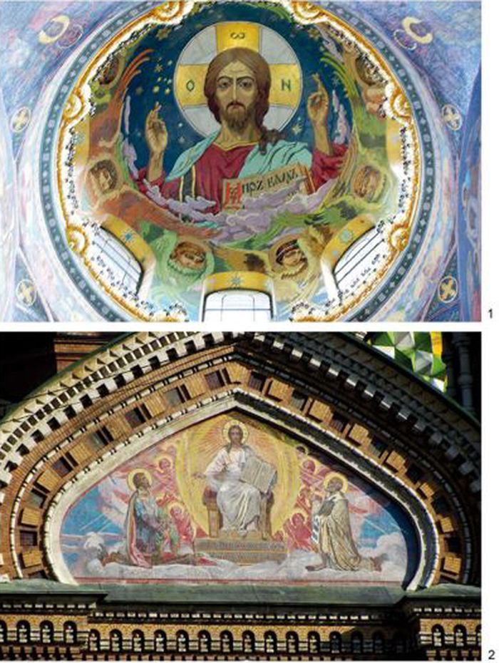 В плафоне центральной главы помещен образ Пантократора (Вседержителя) по эскизам Николая Николаевича Харламова (рис. 2: 1). Господь Вседержитель — это поясное изображение Спасителя, благословляющего руками всех входящих в храм. Раскрытое Евангелие — знак принесенного Им в мир учения. Силуэт Спасителя выделяется на темно-синем фоне, подчеркивающем плоскостность изображения. Лик Господа с огромными темными глазами, устремленными на зрителя, необыкновенно притягателен. Образ Господа плотным кольцом окружают серафимы [Спас на Крови, 2014: 34].