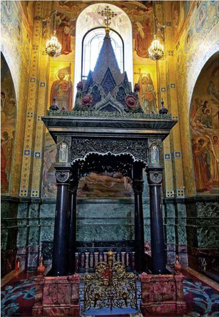 В Спасе на Крови Голгофа и Гроб Господень сливаются в ее западной части [Флай-ер, 1994: 188]. Священное место мученической смерти Александра II получает символическое значение одновременно Страстей, Распятия, Сошествия во ад и Воскресения Иисуса Христа. Подобно Голгофе оно увенчано колокольней снаружи, а внутри как Гроб Господень укрыто под балдахином (сенью).