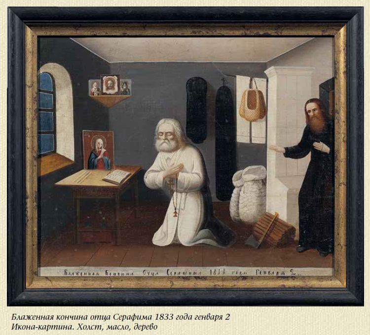 На выставке представлены иконы с различными иконографическими изводами святого. В частности, несколько икон, на которых преподобный Серафим изображен в рост вполоборота влево, на фоне Саровской и Дивеевской обителей. Особенно ценной, на наш взгляд, является парсуна «Праведная кончина преподобного Серафима Соровского», на которой святой изображен без нимба. Такие изображения появляются вскоре после смерти преподобного. Такой образ находился с Саровском монастыре в келии святого и в часовне над его гробницей. Коленопреклоненный старец скончался в молитве пред особо почитаемой им иконой Богоматери Умиления, которую она называл «Всех радостей Радость». Впоследствии иконы с таким сюжетом писались сестрами дивеевской обители, которая славилась как художественный центр. Иконописная мастерская была организована в монастыре в 1854 году живописцем Императорской Академии художеств Н. В. Шумовым. Сестры обители посылались в Санкт-Петербург для изучения живописного и мозаичного искусства. Они писали большие образы на холсте для Троицкого собора Дивеевского монастыря. К началу ХХ века в обители существовали уже большие иконописная и литографическая мастерские.