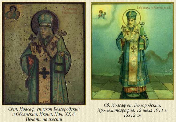 В серии разноформатных поясных и ростовых хромолитографий 1911 года, изданных до и после торжеств прославления святого Иоасафа в мастерских И.Д.Сытина и Е.Коновалова в Москве, точно повторяются детали рисунка, но не цветовое решение киевского портрета-образца. Поклонение императора Николая II святым мощам Иоасафа 4 мая 1904 г. было запечатлено на изданной в Киеве литографии 1911 года[25].