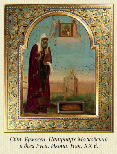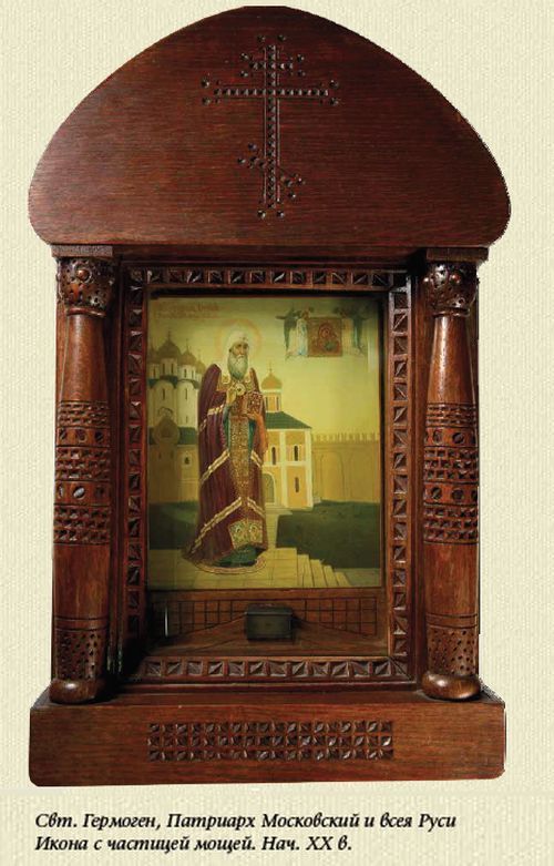 На выставке представлена уникальная икона «Св. Гермоген Патриарх Московский и всея России Чудотворец» с частицей мощей святого (1913 год. Москва. Фирма «П.И.Оловянишникова сыновья»). На лицевой стороне помещено изображение Патриарха Гермогена в рост, в трехчетвертном повороте вправо, благословляющего правой рукой, с Евангелием в левой руке.