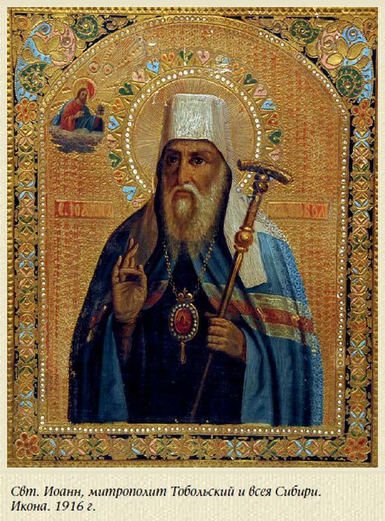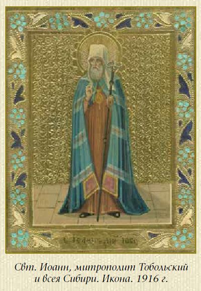 В августа 1917 года в Тобольске образ святителя Иоанна был поднесен игуменией Иоанновского монастыря Марией (Дружининой) императору мученику Николаю II. В мае 1918 года дети подарили императрице Александре Феодоровне икону святителя Иоанна, освященную на мощах святителя в день ее именин; другой образ «в благословение от святителя Иоанна» государь получил от них в день рождения. Царственные страстотерпцы передавали близким двусторонние серебряные образки с изображением святителя И. и Тобольской иконы Божией Матери. В Ипатьевском доме было восемь икон святителя Иоанна – больше, чем других святых[35].