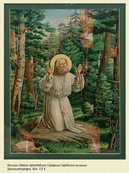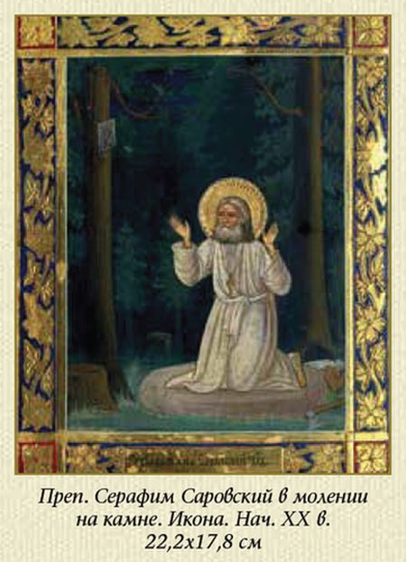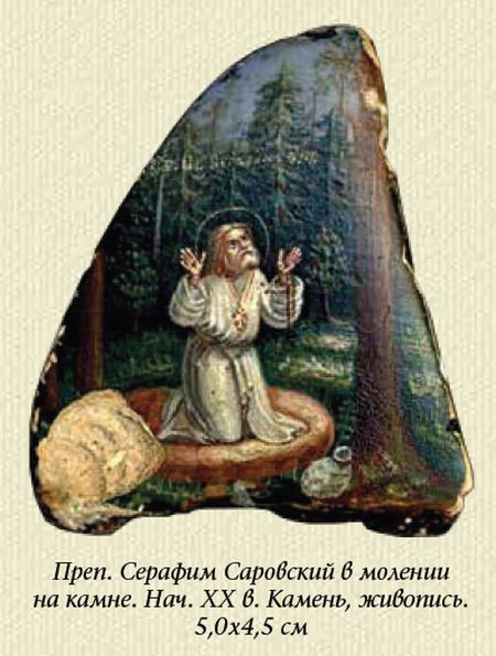В народной же традиции исполнена икона «Моление преподобного Серафима на камне». На ней лес изображен в сине-голубых тонах, что свидетельствует о проникновении в иконопись стилистики модерна. Святой молился на камне тысячу ночей в лесу и тысячу дней в келье. Изображение молитвенного подвига св. Серафима, как одно из наиболее почитаемых, возникло вскоре после кончины преподобного. Наиболее раннее из них висело в часовне над гробницей святого в Саровском монастыре. Перед почитаемым образом «Моление на камне»[5], располагавшимся в южной части иконостаса пещерного храма Феодоровского собора Царского Села (ок. 1912 г.), царская семья стояла во время богослужений. В моленной императрицы Александры Федоровны в пещерном храме находились иконы св. Серафима в молении на камне и кормящего медведя (последняя была написана на доске от кельи преподобного). У каждого из членов царской семьи были свои почитаемые изображения св. Серафима. Небольшая, привезенная из Сарова после канонизации старца, чудотворная икона святого была передана императрице Александре Федоровне по просьбе Великой Княгини Елизаветы Федоровны схиигуменьей Фамарью (Марджановой) для цесаревича Алексея. Этот образ сопровождал царственных мучеников до их кончины[6].