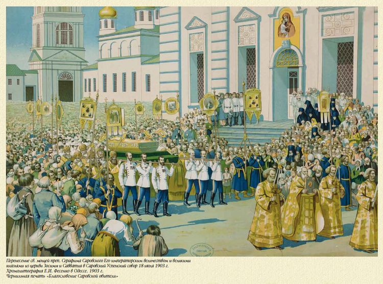 Торжество церковного прославления преподобного Серафима состоялось 19 июля (1 августа н. с.) 1903 года. В нем приняла участие вся царская семья и тысячи людей со всех концов России.