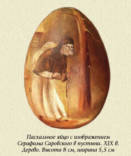 На выставке можно увидеть деревянное пасхальное яйцо с образом св. Серафима в клобуке и полумантии, идущего в Дальнюю пустыньку. На оборотной стороне яйца – надпись: «Христосъ Воскресе, радость моя» – слова, которыми преподобный приветствовал каждого приходящего к нему. Святой написан на яйце без нимба, что свидетельствует о происхождении данного предмета до канонизации преподобного. Сам же извод сложился и получил распространение уже в середине 1830-х годов.