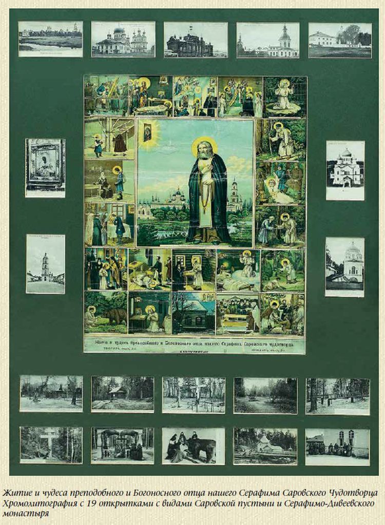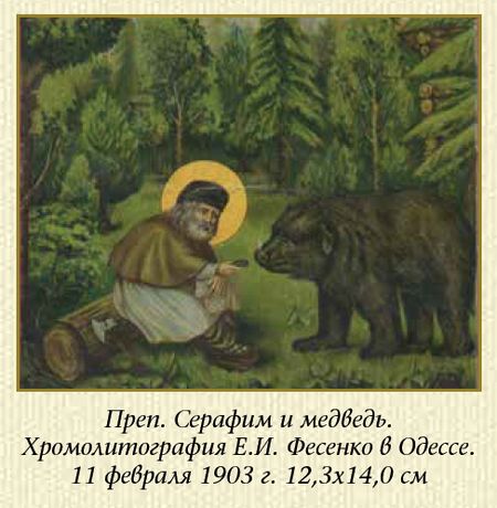 Так на выставке экспонируется литография «Преподобный Серафим, кормящий медведя в лесу». Первое изображение преподобного Серафима с медведем было создано спустя одиннадцать лет после его кончины художником-крестьянином Ефимом Васильевым на основе рассказа старицы Дивеевской обители Матроны (Плещеевой). Художник лично знал преподобного и занимался живописью по его благословению. Изображение это находилось в часовне над гробницей святого. В 1856 году в московской мастерской П.Н. Шарапова была выпущена гравюра (цензорное разрешение 15.09.1856 г., цензор П. Делицын), которое послужило оригиналом для многочисленных переизданий в литографских мастерских вплоть до канонизации святого и в последующем[4].