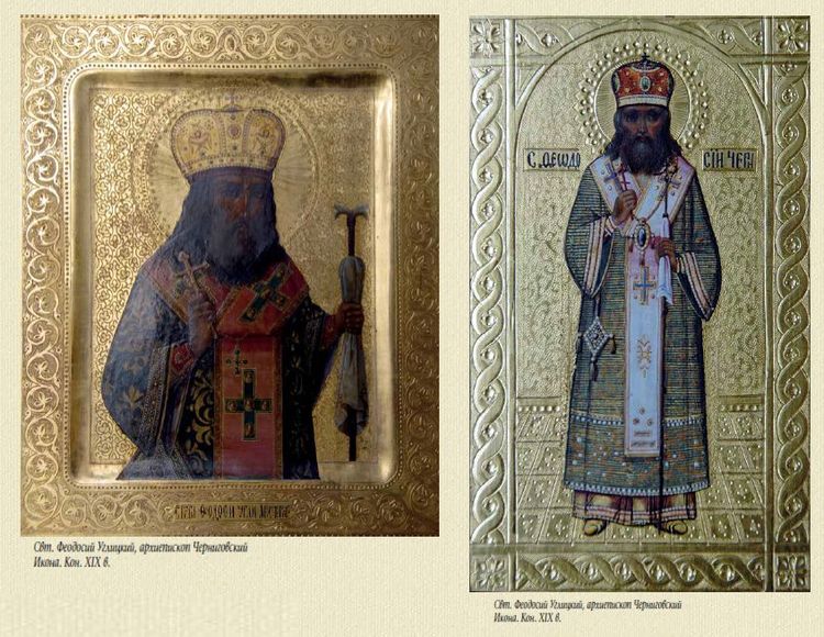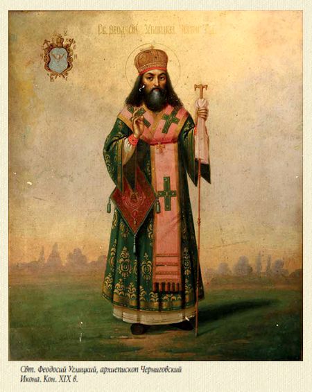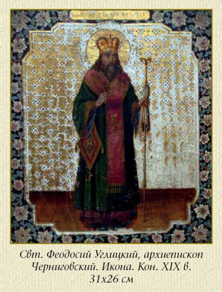 Первым в ряду канонизаций в эпоху Николая II становится святитель Феодосий Углицкий Черниговский Чудотворец, прославленный в лике святых 9 сентября 1896 года. До нас дошли основные два иконографических извода святителя – ростовой и поясной образ. На одной из наиболее ранних икон, близких ко времени канонизации, святитель представлен в рост в саккосе, омофоре и митре, с палицей на правом боку, с поднятым в правой руке наперсным крестом и с посохом с сулоком в левой[2]. Источником подобного изображения послужили парсуны святителя из Черниговского Архиепископского дома. Один из таких портретов был перенесен в кафедральный Спасо-Преображенский (Борисоглебский) собор Чернигова, где покоились мощи святителя Феодосия.