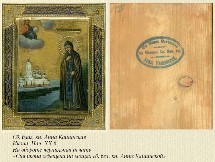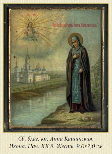 На выставке экспонируется ряд икон святой благоверной княгини Анны Кашинской, повторная канонизация которой состоялась в июне 1909 года. На одной из икон с видом Воскресенского собора и реки Кашинки на обороте имеется чернильная печать: «Сия икона освящена на мощах св. вел. кн. Анны Кашинской».