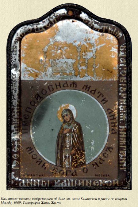 На выставке можно увидеть металлическую иконку с образом Анны Кашинской, раздававшуюся в качестве благословения на память о торжествах в честь прославления святой. В фондах Кашинского филиала Тверского Государственного объединенного музея до сих пор хранятся подобные односторонние жестяные жетоны (7,4 х 4,9 см) с арочным завершением в количестве 41 экземпляра. В нижней части жетона в овале помещено изображение сюжета с молением святой княгини Анны в монашеском облачении, вокруг надпись: «ПРЕПОДОБНАЯ МАТИ АННА МОЛИ БОГА О НАСЪ». В верхней части – изображение раки святой и светильника под сенью. По периметру жетона, на слегка выгнутом бордюре надпись: «1909 г. КАШИНЪ ОТКРЫТИЕ МОЩЕЙ СВЯТЫЯ БЛАГОВЪРНЫЯ КНЯГИНИ АННЫ КАШИНСКОЙ». На верхней части жетона имеется отверстие диаметром около 2 мм. Помещена на жетоне и информация об изготовителе – фирме «А. ЖАКО и К» и месте производства – «МОСКВА»[18].