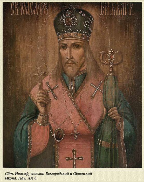 Одной из важных составляющих иконописного образа Иоасафа являлось изображение погребальных облачений, наперсного креста и панагии, находившихся на мощах святителя до их освидетельствования 27 апреля 1910 года[23]. Описания и фотографии подлинных одеяний (голубого саккоса и митры, светло-коричневого омофора, темно-красного подризника, желтых поручей, резного деревянного креста и панагии и др.) были опубликованы с рекомендацией к использованию иконописцами в подлиннике 1911 года Ввиду сохранившихся нетленными священных облачений святого Иоасафа Курская церковная историко-археологическая комиссия признала желательным, чтобы на иконных изображениях Святителя архиерейские его облачения, включая наперсный крест и панагию, писались в соответствии с подлинными. Именно они чаще всего воспроизводились на иконах новоявленного чудотворца, например на небольшом ростовом образе 1910-х годов из Государственного Исторического музея[24], который по высокому художественному уровню и стилистическим особенностям приписывается московской мастерской М.И.Дикарёва, выходца из села Мстёра Владимирской губернии Иоасаф представлен стоящим на орлеце, с крестом и жезлом в руках, на фоне Троицкого монастыря Белгорода, где покоились святые мощи чудотворца, в облаках - поясной образ благословляющего Спасителя.