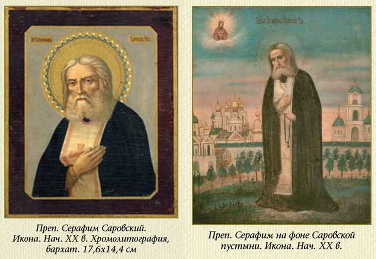 Иконы с видами Свято-Успенского Саровского и Свято-Троицкого Дивеевского монастырей получают широкое распространение после канонизации старца. Святой традиционно изображен в рост, с прижатой к епитрахили правой рукой, в левой опущенной руке лестовка – благословение матери. В верхнем левом углу – келейная икона Богоматери Умиление, перед которой он преставился.