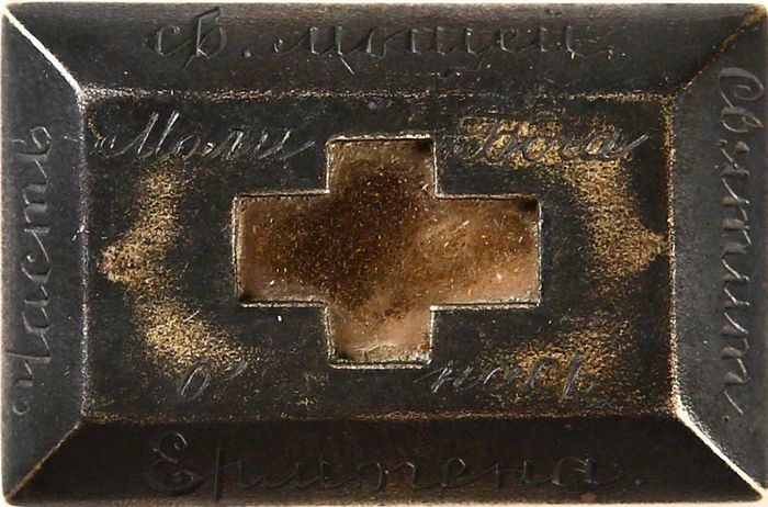 Ковчег-мощевик исполнен в форме прямоугольной коробочки со съемной крышкой со скошенными бортами. В центре крышки прорезь в форме четырехконечного креста, закрытого стеклом. Под стеклом помещена частица мощей Св.Гермогена. По периметру крышки идет гравированная надпись прописью: “Часть св.мощей Святителя Ермогена”. Около креста надпись: “Моли Бога о насъ”. Стенки ковчега украшены гравированными четырехконечными крестами с исходящими из средокрестия лучами сияния.