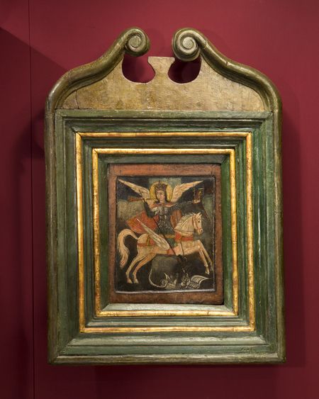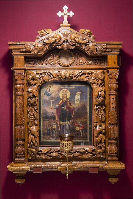 К концу XIX века неорусский стиль – национальный вариант модерна – становится доминирующим в произведениях декоративно-прикладного искусства. В памятниках рубежа XIX-XX столетий, выполненных в этом стиле, присутствуют переосмысление форм народного искусства и ориентация на праздничную полихромность искусства эпохи царя Алексея Михайловича. Стилизованный «красный угол» эпохи модерна задумывался и изготавливался как цельный ансамбль, вместе с киотными резными полочками, покровцами и лампадами. Такое дизайнерское решение могли позволить себе представители духовной и художественной элиты России. В их число входили лица высшего духовенства, стремившиеся к обновлению Церкви и церковной жизни, члены императорской фамилии, включая императрицу Александру Федоровну, ее старшую сестру Великую княгиню Елизавету Федоровну и президента Академии Художеств Великую княгиню Марию Павловну, близкие ко двору круги дворянства, представители торгово-промышленных семейств России. Великий князь Гавриил Константинович, сын К.К.Романова, вспоминал, что «в молельной у отца, в Мраморном дворце, между кабинетом и коридором, висело много образов и всегда теплилась лампадка. Каждый день приносили в молельню из нашей домовой церкви икону того Святого, чей был день. Эти иконы, все в одном и том же стиле, дарили отцу мои дяди, Сергей Александрович и Павел Александрович. Позднее, когда мы подросли и уже самостоятельно приходили к отцу здороваться, дежурный камердинер нам говорил, что нельзя войти, потому что «папа молится». Помолившись, отец здоровался с нами и шел в столовую». Сам Великий князь К.К. Романов, начиная работу над драмой «Царь Иудейский», писал 27 марта 1909 года в своем дневнике: «Начал ее с изображения торжественного входа Спасителя в Иерусалим. <…> Я суеверен: начало положено в святой день – Страстную пятницу. Не предвещает ли это добрый конец? Перед началом помолился и приложил к рукописи образ-складень от Сергея, который всегда лежит на моем письменном столе. Так я делаю часто, когда особенно сильно желаю успеха какому-либо делу: письму, просьбе, сочинению».