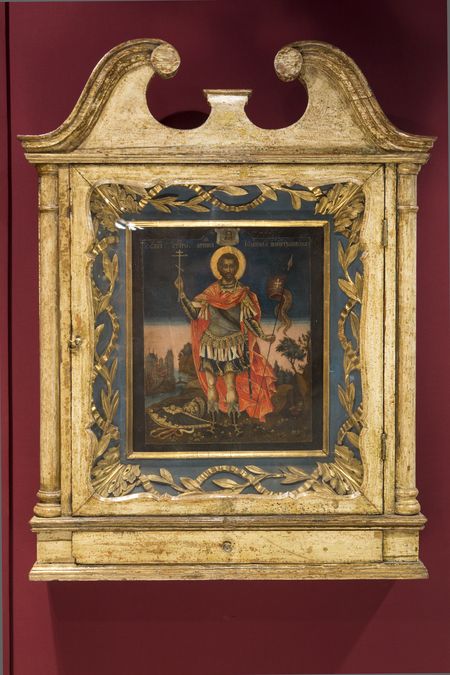 Разновидностью домовых храмов являлись полковые и корабельные. В 1910 году в носовой части парохода была устроена церковь Святителя Николая Чудотворца, которая окормляла так называемый плавучий город с населением до 100 тысяч человек, располагавшийся в Каспийском море в 220 километрах от Астрахани – сотни морских судов, плавучих контор со штабом служащих, контролировавших движение грузов. Большинство жителей этого города в течение семи - восьми месяцев в году не ступало на берег. Действовала эта уникальная церковь на пароходе лишь до 1916 года. На выставке представлен редчайший образец корабельного киота, выполненный из бронзы (собрание А.Н. Ларичкина).