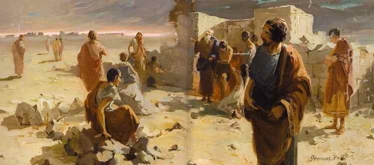 Самый ранний из сохранившихся академических эскизов, написанных в первые годы учебы в мастерской И.Е.Репина, за который Николай Фешин 30 марта 1903 года получил Первую премию академического совета в 100 рублей. Эскиз многофигурной композиции должен был отвечать определенным правилам. Расположение фигур Фешин подчиняет W-образной линии. В этом эскизе проявилось качество, впоследствии свойственное всем многофигурным композициям Фешина, - отсутствие главного героя.