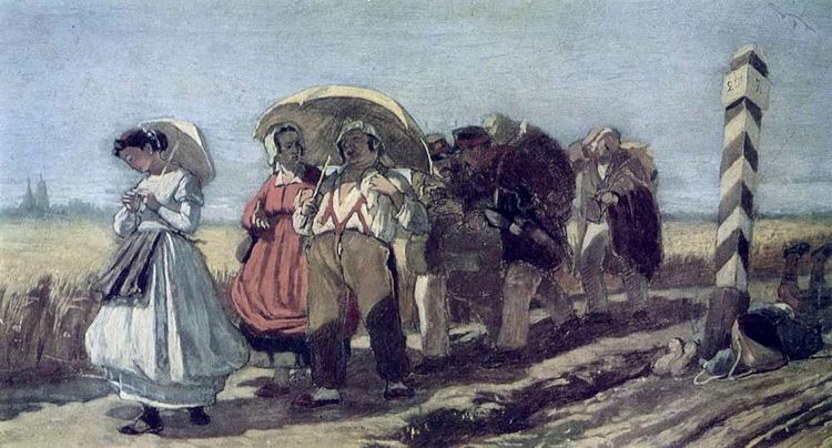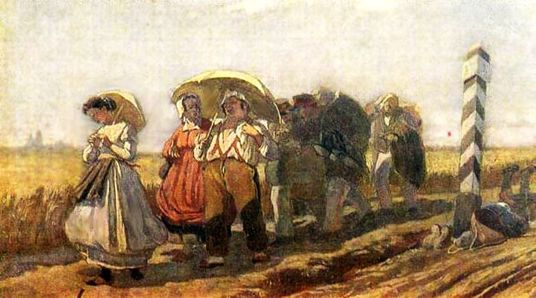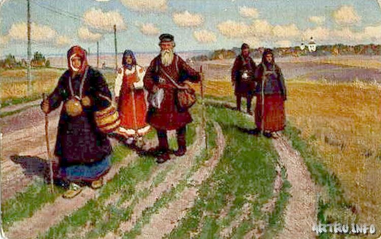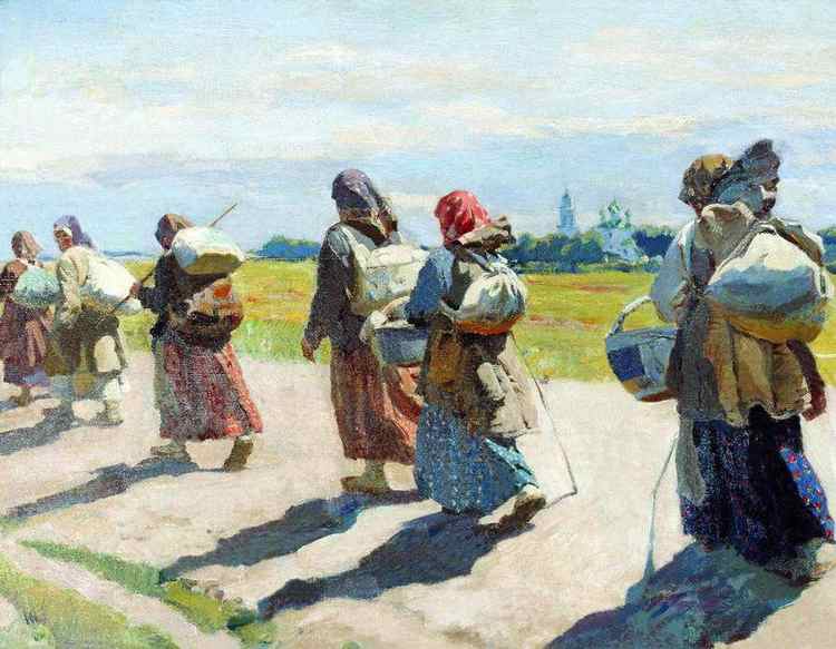 Крестьяне могли поодиночке или группами ходить в ближайшие монастыри к большому празднику. Была еще категория странников, для которых путешествия к святым местам были образом жизни на длительный период. Картины, посвященные странникам, размещены в отдельной подборке.