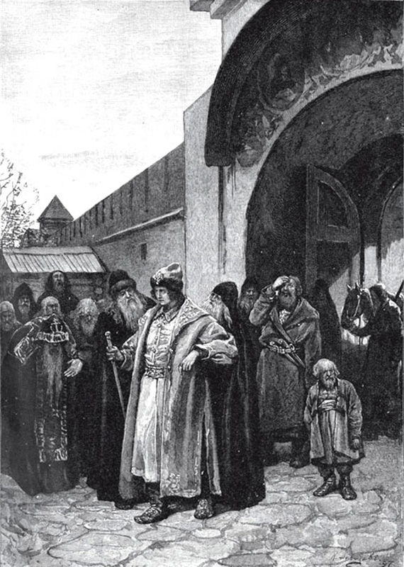 Сюжет заимствован из романической истории любви царевны-правительницы Софьи (родной сестры Петра Великого) с её ближним боярином, знаменитым князем Василием Голицыным. Князь отправился в поход против Крымцев — и всякая весть о нем дорога. Царевна, тоскуя и сокрушаясь о любимом человеке, мучимая неизвестностью, решилась идти на богомолье в Троицкую обитель. Вот она, сопровождаемая только одной боярыней и одной постельницей, при небольшой охранной страже из стрельцов, — уже приближается к Святым воротам обители, а ей навстречу, с низким поклоном, подходит нарочный, посланный с письмом от её любимца. Царевна, от радости, теряет всякое самообладание и спешит поскорее прочесть дорогие строки... Она передает свой дорожный посох боярыне и на ходу читает письмо князя Василия, писанное мудреной, только ей ведомой «цифирью» — в это время гонец, привезший письмо, почтительно сторонится, уступая ей путь к воротам обители, около которых стоят его кони и свита и сидят живописные группы калек-перехожих, распевающих свои духовные стихи artefakt.in.ua