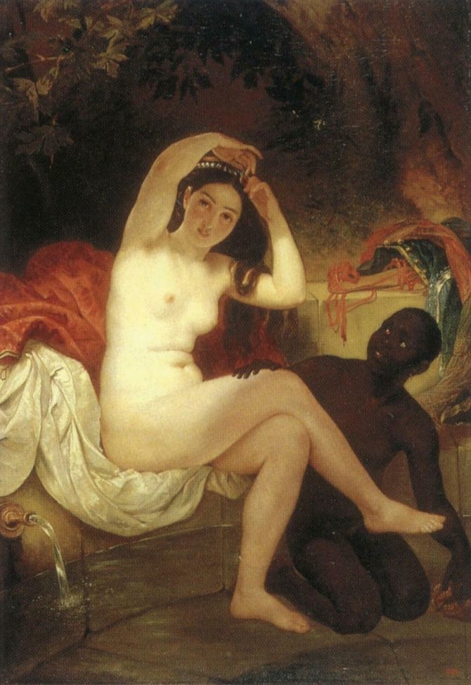 Примерно в 1832 году Карл Брюллов создал полотно, явившееся своеобразным итогом его многолетних творческих исканий в мифологической и жанровой живописи. Замыслив картину «Вирсавия», он самозабвенно начинает над ней работать в течение четырех лет. Автора переполняло желание изобразить обнаженное человеческое тело в лучах заходящего солнца. Пронизывающая картину тонкая игра света и тени, воздушность окружающей фигуру среды, не помешали автору придать силуэту четкость и скульптурную объемность. В картине «Вирсавия» Брюллов искусно изображает чувственную эротику, откровенно по-мужски любуясь каждой складочкой на стройном теле и каждой прядью распущенных густых волос. Для того, чтобы усилить впечатление, мастер применил эффектный цветовой контраст. Мы видим, как белизну матовой кожи Вирсавии оттеняет смуглая темная кожа служанки-эфиопки, нежно прильнувшей к своей госпоже.