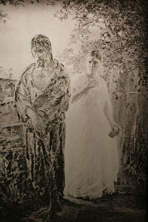 – Мы располагаем фотографией этой работы. Она была опубликована в альбоме, изданном сыном художника Николаем Николаевичем Ге-младшим, в 1903 году. «Милосердие» представляло собой двухфигурную вертикальную композицию: мужская и женская фигуры в полный рост в окружении летнего сельского пейзажа. Второе название картины «Милосердие» – «Не Христос ли это?». Молодая женщина подает нищему воды в кружке в жаркий день и задается этим вопросом. В этой картине Ге стремился зримо представить слова Нагорной проповеди: «Блаженны милостивые, ибо они помилованы будут» (Мф. 5: 7)/ Идеи милосердия, добра, любви были очень важны для Ге всегда. Поэтому таким органичным было его толстовство, такой горячей дружба с писателем.