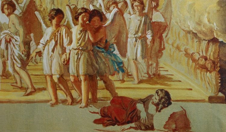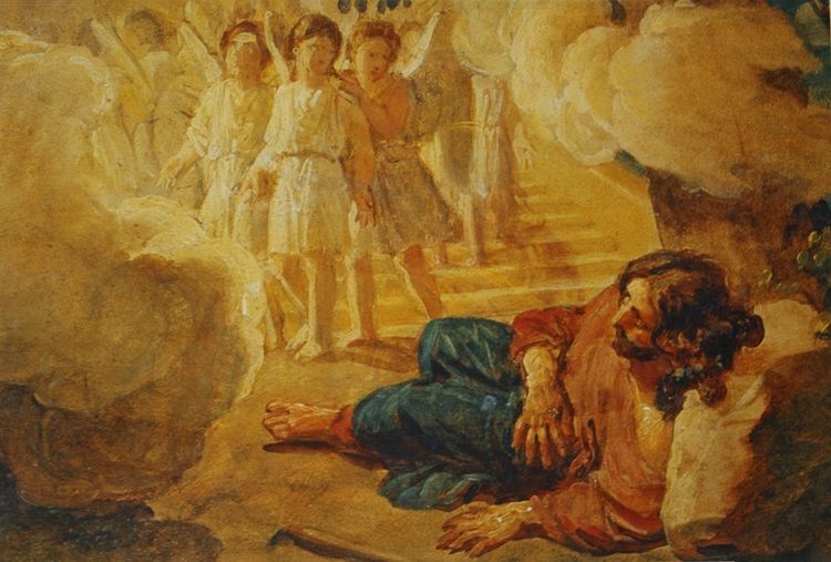 «Иаков же вышел из Вирсавии и пошел в Харран, и пришел на одно место, и остался там ночевать, потому что зашло солнце. И взял один из камней того места, и положил себе изголовьем, и лег на том месте. И увидел во сне: вот, лестница стоит на земле, а верх ее касается неба; и вот, Ангелы Божии восходят и нисходят по ней. И вот, Господь стоит на ней и говорит: Я Господь, Бог Авраама, отца твоего, и Бог Исаака; [не бойся]. Землю, на которой ты лежишь, Я дам тебе и потомству твоему; и будет потомство твое, как песок земной; и распространишься к морю и к востоку, и к северу и к полудню; и благословятся в тебе и в семени твоем все племена земные; и вот Я с тобою, и сохраню тебя везде, куда ты ни пойдешь; и возвращу тебя в сию землю, ибо Я не оставлю тебя, доколе не исполню того, что Я сказал тебе. Иаков пробудился от сна своего и сказал: истинно Господь присутствует на месте сем; а я не знал! И убоялся и сказал: как страшно сие место! это не иное что, как дом Божий, это врата небесные. И встал Иаков рано утром, и взял камень, который он положил себе изголовьем, и поставил его памятником, и возлил елей на верх его. И нарек [Иаков] имя месту тому: Вефиль, а прежнее имя того города было: Луз. И положил Иаков обет, сказав: если [Господь] Бог будет со мною и сохранит меня в пути сем, в который я иду, и даст мне хлеб есть и одежду одеться, и я в мире возвращусь в дом отца моего, и будет Господь моим Богом,— то этот камень, который я поставил памятником, будет [у меня] домом Божиим; и из всего, что Ты, Боже, даруешь мне, я дам Тебе десятую часть». Книга Бытия