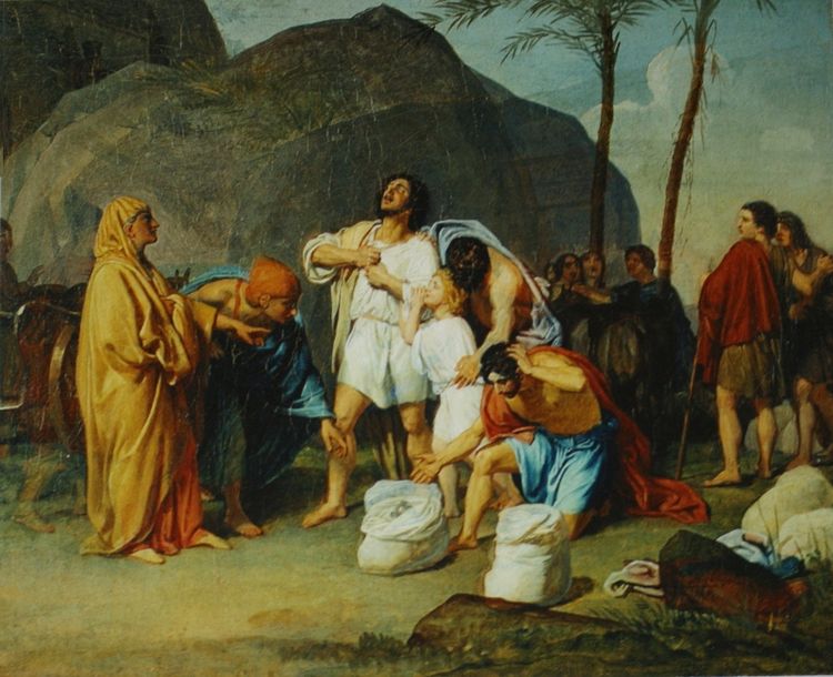 Драматичный момент, изображенный на картине, взят из библейской истории со счастливым концом. Иосиф, проданный братьями в рабство в Египет, вскоре возвысился и стал знатным вельможей при дворе фараона. Однажды в Египет по торговым делам пришли его братья. Он вызвал их к себе, но братья не узнали Иосифа в грозном египетском начальнике. Он, не раскрывая себя, узнал у путешественников об их семье, об отце Иакове, о младшем брате Вениамине, который остался дома – из всех он был единственным единоутробным братом Иосифа. Провожая братьев, он был с ними щедр, но одного из них оставил в залог с тем, чтобы они в следующий раз привели к нему Вениамина. Тем пришлось подчиниться. Иосиф не открылся и Вениамину, но, одаривая братьев, всегда давал ему больше, чем остальным. Не желая расставаться с ним, Иосиф придумал хитрость: он велел слуге наполнить мешки братьев серебром, а в мешок Вениамина подложить еще и дорогую чашу. Братья отправились в обратный путь, но по дороге их нагнал человек Иосифа с вопросом: «Для чего вы заплатили злом за добро? Для чего украли серебряную чашу?» Братья начали отрицать воровство, предлагали осмотреть вещи, а если у кого найдется чаша, пусть того казнят или продадут в рабство. Чаша, понятно, нашлась в мешке Вениамина. Его повезли обратно к Иосифу, но и остальные братья последовали за ним. Дело в том, что Вениамин был любимым сыном отца Иакова, и братья обещали старику привезти его целым и невредимым. Братья, некогда продавшие в рабство Иосифа и объявившие отцу, что он умер, к их чести, повторять подобный номер не хотели. Старший брат Иуда стал просить у Иосифа сделать его рабом вместо Вениамина. Это так тронуло Иосифа, что он не смог уже сдерживаться и открылся братьям во всем.