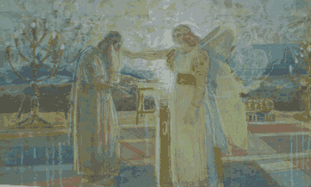 С особенным вдохновением он писал сцены чудес – эти прорывы в бесконечное, эти маяки светлой надежды на трудном пути людей. Он находит для них необыкновенный художественный язык. Один из лучших эскизов – “Ангел поражает Захарию немотой” (1)(ангел возвещает священнику Захарии о грядущем рождении у него сына, будущего Иоанна Предтечи; старый Захария не может поверить, и ангел поражает его за неверие немотой). Штраус в своей книге не уделяет большого внимания этому эпизоду, ограничивается тем, что отмечает его эпигонский характер по отношению к Ветхому завету. Но Иванов посвящает ему великолепный лист. Быть может, художника захватила тема сомнения и веры, внутренне ему близкая: сомнение сковывает уста, вера освобождает. Сомневающийся Захария умудрен опытом, стар, спина его сгорблена, божественный вестник могуч и молод, у него прямая величественная фигура, сильные раздвоенные крыла, как у ассирийских божеств. Его жест властен и непреложен. Эта замечательная акварель – настоящая поэма света, бледно-золотого, белого, голубоватого. В волнах сияния, исходящих от архангела, сливающихся со струящимся светом семисвечника, утопают своды, растворяются предметы храмовой утвари. Нет отчетливых очертаний, контуры слегка двоятся – но это не от незаконченности (лист принадлежит к наиболее завершенным): под кистью художника непроницаемая материя вещества как бы изменила свою природу, став трепетной материей света.