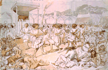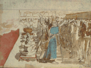 В листе “Поклонение золотому тельцу”(15) группа пляшущих очень похожа на древнеегипетские изображения танцоров: плечи в фас, лица в профиль, такие же движения рук. В альбомах Иванова имеются заготовки – танцующие фигуры, срисованные с атласа по египетскому искусству. Интересно, что скопированы они не совсем точно, но заметно снижены: в позах придворных танцовщиц есть что-то напоминающее пляску подгулявших простолюдинов. Так это и вошло в композицию “Поклонение золотому тельцу”: беженцы в отсутствие Моисея воздвигли языческий золотой кумир и предаются разгулу. Пляшут, бьют в бубны, пьют; какой-то упившийся голый старик заснул, лежа на животе; есть тут и довольно недвусмысленная сцена пьяного соития.