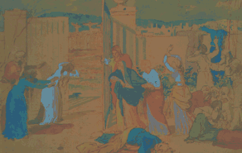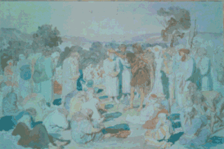 Эффект подлинности и соприсутствия нарастает в новозаветном цикле. Здесь картина мира изменяется, становясь взволнованной, динамичной; здесь широко раздвигается пространство, перспективные планы уводят вглубь, своды огромного Соломонова храма тонут в вышине, появляются многолюдные толпы – рыбаков, мытарей, фарисеев, бедняков, женщин, детей. И среди них – загадочный проповедник в темно-синем плаще, как магнитом притягивающий эти людские скопища. Порой кажется, что художник сам бродил под жгучим палестинским солнцем вслед за пестрой толпой, прислушиваясь к волнующим речам проповедника.
