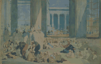 Этому посвящены десятки композиций. Христос проповедует в Соломоновом храме (32), на горе, на лодке, исцеляет больных и изгоняет торгующих из храма, произносит слова осуждения “Иерусалиму, избивающему пророков”(35), садится за трапезу с бедняками, призывает к себе детей, обличает лицемерие фарисеев. За ним следуют его ученики, ему внимают народные толпы; фарисеи и священники задумывают расправу с диковинным проповедником, но исходящая от него неодолимая духовная сила парализует их попытки. Возбужденную, накаленную атмосферу этих сцен удачно характеризует М. М. Алленов: “Евангельские сцены Иванова овеяны духом дискуссий и словопрений. Люди здесь прислушиваются, вопрошают, удивляются, негодуют и жаждут немедленной справедливости”. Алленов выделяет из всего множества листов акварель, названную “Проповедующего в притчах Христа хотят схватить первосвященники и фарисеи”(33). Здесь Иисус спокойно стоит перед своими недругами, заграждающими ему вход в храм, а за его спиной, на площади до самого горизонта – несметные толпы: зримый символ народов мира, которые в будущем примут учение Христа.
