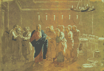 В сценах сокровенных бесед и таинств образ отсвечивает иными гранями: сын человеческий предстает ре-флектирующим, погруженным в раздумья, скорбным. Здесь особенно значительно изображение Тайной вечери – центрального евангельского рассказа о заключении Нового завета между Богом и людьми. О священном событии великого четверга, положившем начало христианской церкви, единодушно повествуют все четыре евангелиста; сомневаться в его исторической истинности Иванов не мог. Оно не сопровождалось какими-либо сверхъестественными знамениями, а вместе с тем полно неизъяснимой тайны, и это надо было выразить. Световые феерии, как в “Благовещении”(22) или “Преображении”, тут были бы неуместны, а простое, “реалистическое” изображение трапезы недостаточно. “Тайная вечеря” Леонардо не могла не повлиять на решение композиции, но у Леонардо вечеря происходит при полном дневном свете, что для Иванова неприемлемо. Он занялся поисками вечернего освещения. После ряда предварительных набросков он остановился на варианте с темным коричневатым фоном, передающим полумрак горницы. Высоко под потолком помещенный светильник освещает стол и бросает отсветы на фигуры апостолов, возлежащих вокруг стола на низких ложах. Эти отсветы художник обозначает не размытыми пятнами, а резкими линейными пробелами наподобие иконных “оживок” или “движков”. Белильные вьющиеся штрихи, выступающие из сумрачного фона, могут напоминать о фресках Феофана Грека (которого Иванов, конечно, не знал, но знал византийские росписи). Они-то и создают атмосферу тайны и внутреннего напряжения при внешней тишине. Таким же приемом написана отдельно сцена изобличения Иуды (здесь фигуры Христа и Иуды вынесены на первый план)(36) и с наибольшей впечатляющей силой – “Выход с Тайной вечери”(37). Здесь появляется “леонардовский” Христос с его прекрасным и странным жестом самоотречения, покорности воле Отца.