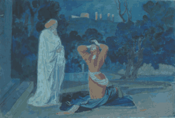 Меньше удались художнику сцены в Гефсиманском саду (38), хотя они закончены в цвете и впечатление глубокой, томительно-синей ночи достигнуто. Но цвет отяжелен, а поза Христа, склоняющегося перед белоснежным ангелом, явно искусственна.