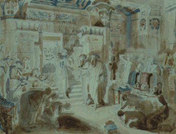 Вся группа рисунков, относящихся к Книге Бытия, выдержана в тоне спокойного эпического рассказа – еще не об истории, но о предыстории народов Израиля. Здесь даны только простые и древние пласты человеческого бытия: шатры кочевников, стада, рождение и смерть, юность и старость, мужчина и женщина. Все это художник показывает обобщенно и крупно, не индивидуализируя, не вдаваясь в детали. По-иному он подходит к иллюстрированию второй книги Пятикнижия – “Исход”, связанной с деяниями Моисея, возглавившего исход евреев из Египта. Это событие историки относят к эпохе Размзеса II, к ХIII веку до н. э., его отделяет от легендарных времен Авраама не менее шести столетий. Теперь исторический колорит сгущается: Иванов вносит в свои композиции приметы конкретного времени, основываясь на данных археологии, на изучении египет-ских памятников. С большим художественным тактом он привносит элементы древнеегипетского стиля – чеканные ритмы, своеобразные развороты фигур. Детально проработанная акварель “Фараон просит Моисея вывести евреев из Египта”(11) смотрится как настоящая историческая картина. Интерьер дворца фараона представлен со всеми “точностями антикварскими”, стволы и капители колонн покрыты типичным египетским орнаментом. Фараон, спускаясь по ступеням, горестно закрывает лицо рукой, его подданные также охвачены отчаянием от постигших страну бедствий – одни заламывают руки, другие простирают руки к Моисею и Аарону, некоторые падают на колени и склоняются до земли. В их бурной, но ритмической, как бы ритуальной жестикуляции узнается экспрессия “плакальщиков” древнеегипетских рельефов.