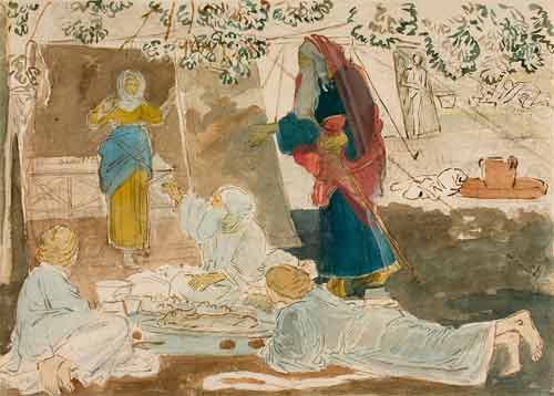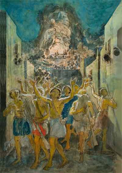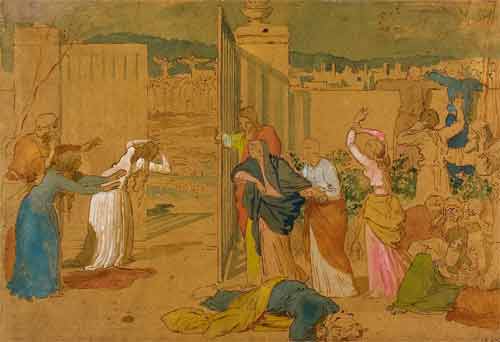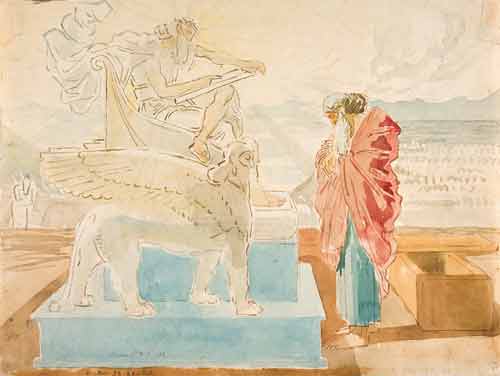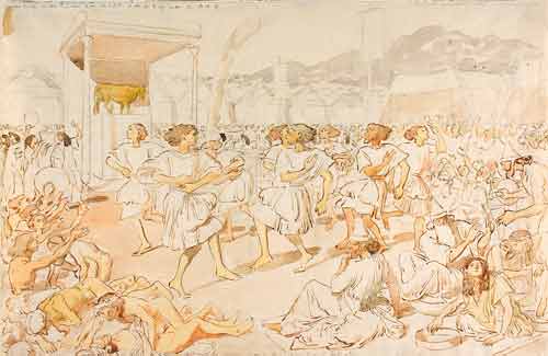 Может быть, не случайно, а подсознательно избрал Иванов для работы над эскизами технику акварели. Вовсе не потому, что она требовала меньших материальных затрат, а почувствовав чисто интуитивно, что возможности акварели, органичное соединение в ней живописного и графического начал могут создать ту меру условности, которая столь необходима для стенной живописи.