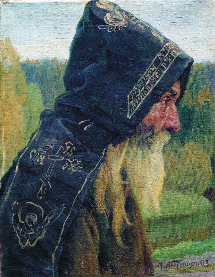 С самого начала вошла в его жизнь Троице-Сергиева Лавра, куда он очень любил ездить. Во время своих частых наездов сюда он наблюдал жизнь монахов, общался с ними. Именно там он и приметил одного старого монаха, который не сразу, но всё же согласился позировать художнику. Спустя много лет Нестеров вспоминал: «Мой старичок открыл мне какие-то тайны своего жития. Он со мной вёл беседы, открывал мне таинственный мир пустынножительства, где он, счастливый и довольный, восхищал меня своею простотой, своей угодливостью Богу. Тогда он был мне так близок, так любезен».