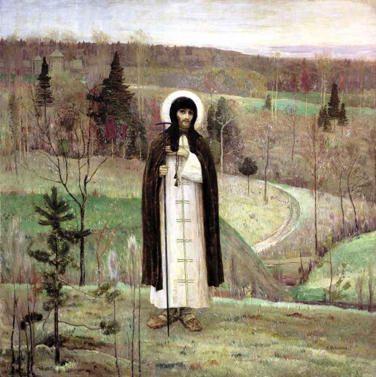 Внешне построение картины очень простое, никакого пластического мудрования. И всё же слышится в ней какая-то тихая, словно исподволь набирающая силу высокая, торжественная нота. Возвышающиеся один над другим планы задали всей композиции восходящий ритм, который включает в свою динамику увенчанную ореолом фигуру преподобного и держит её над всей этой землёй с её широкими, бескрайними просторами. И уже не как фон, а как образ России воспринимается открывшийся пейзаж, обретший, благодаря своей ритмической организации, особую, внутреннюю монументальность. Исходящая, кажется, от самых корней, из самой глуби, она заполнила собой весь образный строй картины. И сама эта монументальность — не подавляющая, а по-нестеровски лёгкая, ненарочитая, наделённая какой-то неземной, мистической силой. И потому сам преподобный на полотне воспринимается и как неотъемлемая часть этой земли, и как её охранитель. Не старцем, а довольно молодым человеком изобразил его художник, подчеркнув тем самым его вневременную святость и вечное почитание этого святого на Руси.