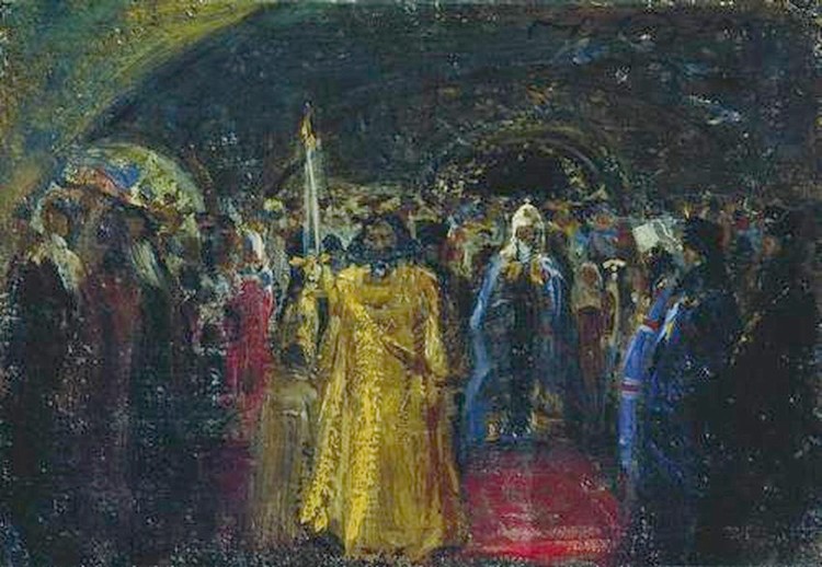 ![]() Выход патриарха Гермогена. И. Е. Репин. 1881 г. Картон, масло. 12,3х18,4 см Эскиз неосуществленной картины Государственная Третьяковская галерея, Москва  |