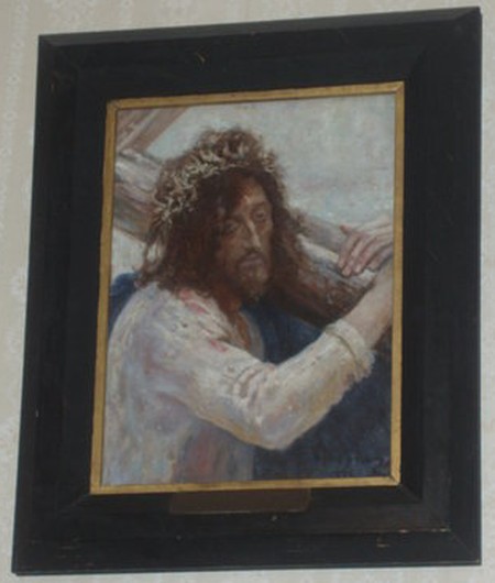 ![]() Христос в терновом венце. И. Е. Репин. 1913 г. Фреска, цементная плита, штукатурка, краски «Кюнстерфарбер». 51х45. Подпись и дата слева внизу: «И. Репинъ 1913». Выставлялась в Москве на аукционе в 2002 г. Частное собрание |