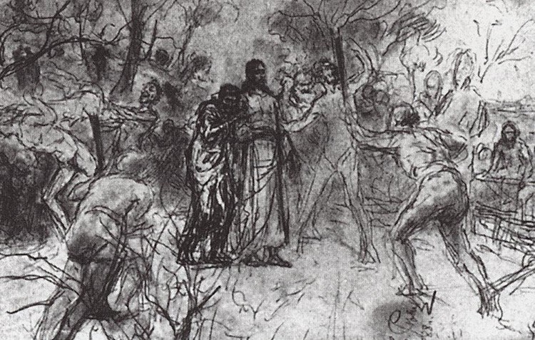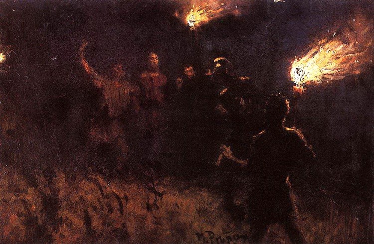 ![]() Взятие Христа стражею (Арест Христа). И. Е. Репин. 1886 г. Холст, масло. 36,5х55,5. Эскиз. Государственный Русский музей, Санкт-Петербург |