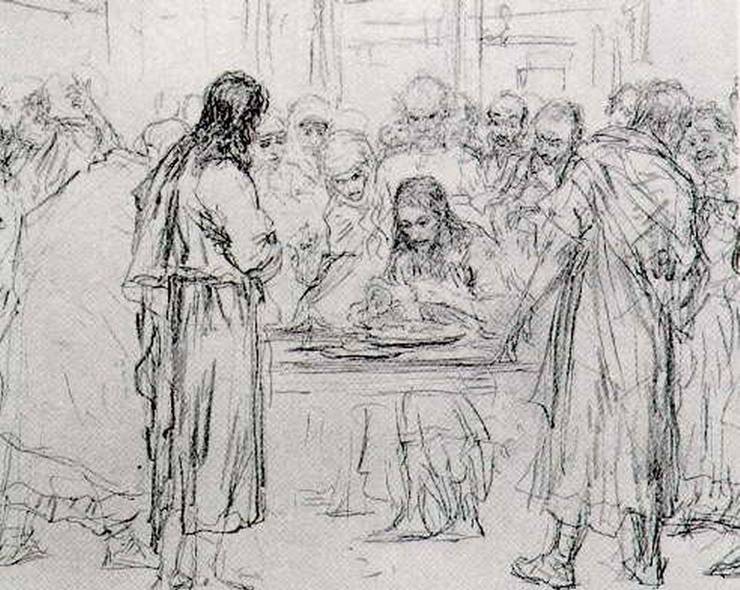 ![]() Христос среди учеников после Воскресения. И. Е. Репин. 1886 г. Бумага, граф.карандаш. Эскиз композиции. Государственный Русский Музей, Санкт-Петербург |