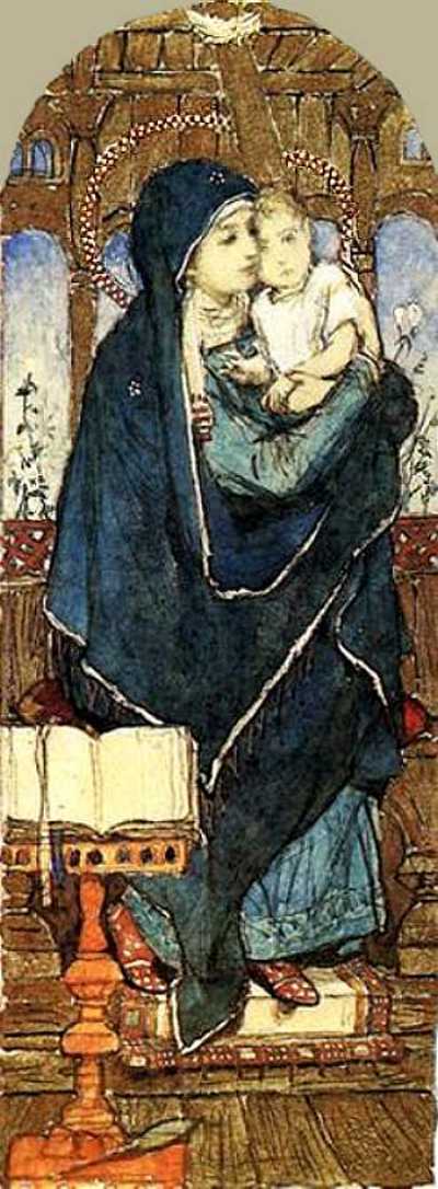 Большое впечатление в соборе производил запрестольный образ Богоматери. Колоссальная фигура Богородицы с Христом-младенцем на руках, выступающая из мерцающего золотого света в верхней половине алтарной апсиды, господствовала над всем пространством нефа. С простотой и человечностью воплотил художник в образе Богоматери красоту женственности, силу материнского чувства и проникновенную одухотворенность. При этом им был выражен национальный тип русской красоты. Недаром Богоматерь Васнецова стала одним из любимейших образов сразу же после освящения Владимирского собора. Репродукции с него можно было встретить во многих домах России в конце XIX -начале ХХ века.
