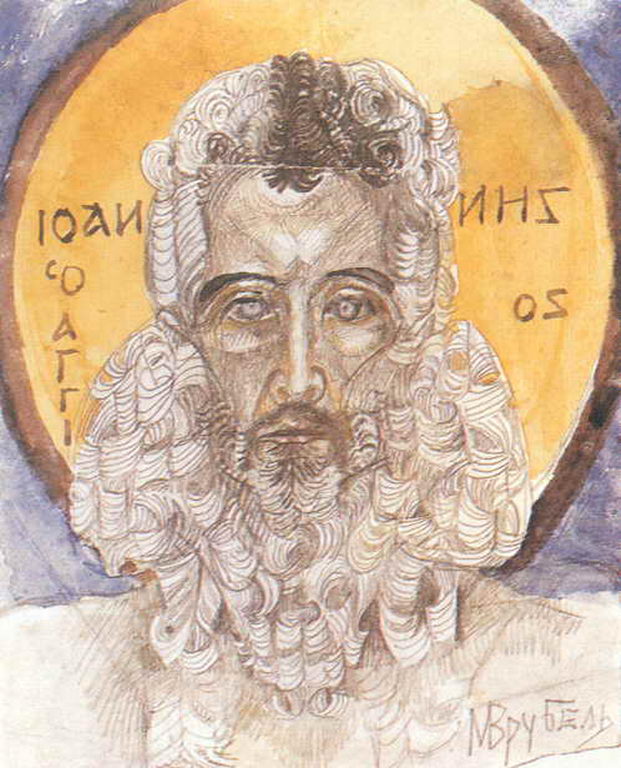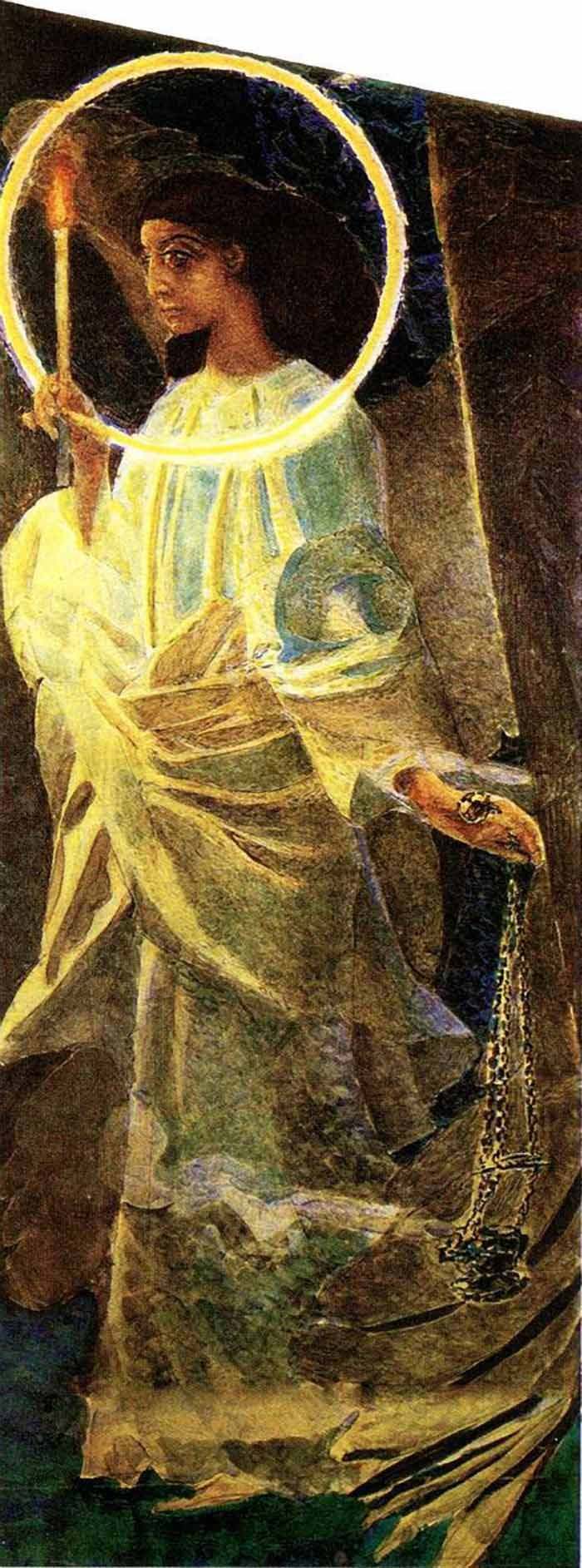 В Киеве Врубель увлечённо занимался религиозной живописью. Он восстанавливал древние фрески Кирилловской церкви, сделал на стенах храма несколько росписей. Среди работ того времени — небольшое изображение Ангела. В переводе с греческого слово «ангел» означает — «вестник». Бестелесный вестник в человеческом образе юноши с крыльями за спиной передаёт людям волю Бога и помогает её исполнению. Врубель поразительно показал бестелесность Ангела. Тонкие белые одежды, окутывающие его стан, пронизаны воздухом, светом, небесной голубизной. Лёгкая невесомая походка подобна плавному движению облака. Под его ногами не чувствуется плотности земли. Позади — бесконечная синева космоса. В правой руке Ангела — горящая свеча: Божественный свет, который он несёт людям. В левой — кадило на освобождённой от тяжести золотой цепи: с его благовонным дымом распространяется дыхание чистой веры. У врубелевского Ангела смуглый лик, отмеченный чертами Востока, плотные иссиня-чёрные волосы, слегка откинутые встречным ветром. Взгляд его огромных глаз под длинными изогнутыми бровями непостижим, задумчив и кроток. Русская живопись